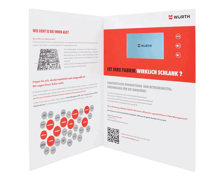 Unsere Videobroschüre im A4-Format vereint beeindruckende Präsentation mit moderner Technik und ist die ideale Wahl für hochwertige Marketingmaterialien, Schulungen oder besondere Anlässe. Diese elegante Karte besteht aus solider 350 g Kartonage, die sich aufklappen lässt, um auf der rechten Seite einen Bildschirm in verschiedenen Größen zu enthüllen: 4″, 5″, 6″, 7″, 8″ oder 10″.